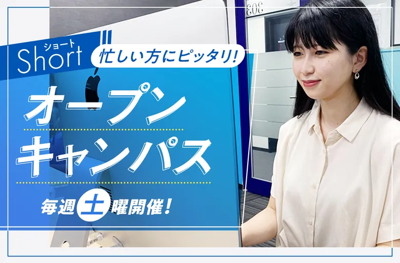 部活やバイトで忙しい高校生や平日は仕事で忙しい社会人の方など、土曜日に気軽に参加できるショートオープンキャンパスを開催!学校生活を楽しく、安心して過ごして頂くため、カリキュラムや学校生活サポートなど、担当スタッフが詳しく紹介。保護者様もご一緒にご参加いただけます。