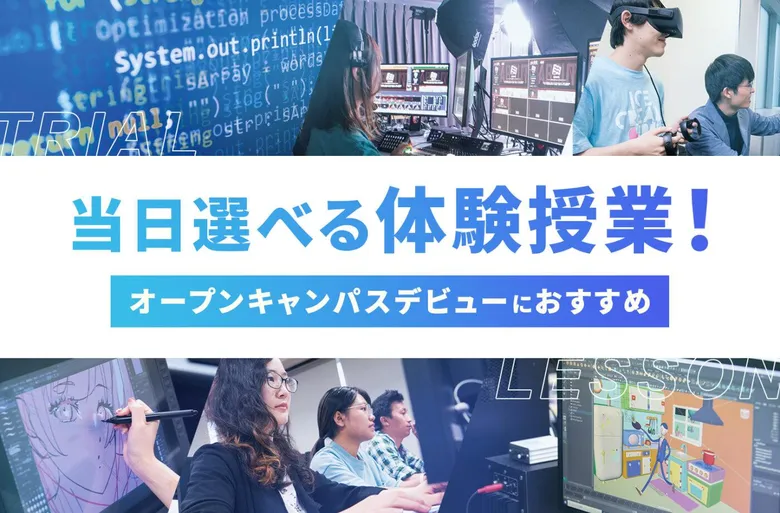 当日来校して、4分野の説明から気になるものを聞いてみよう!その後、体験授業を1つ選んで体験できます。最大4分野すべて聞けるので、初めてのオープンキャンパス参加や、分野の違いや業界について知りたい方。気になる分野がたくさんある方におすすめです!来校してから体験授業を選べるので、自分だけのオープンキャンパスをつくりましょう!
