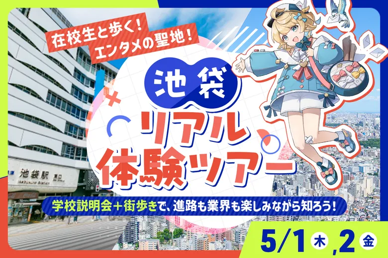 本校に集合して学校の説明会に参加したあとは、ゲーム・アニメ・ITなどエンタメ業界に関連する店舗や施設が集まる池袋エリアを、学生スタッフと一緒に巡るスペシャルツアーです!