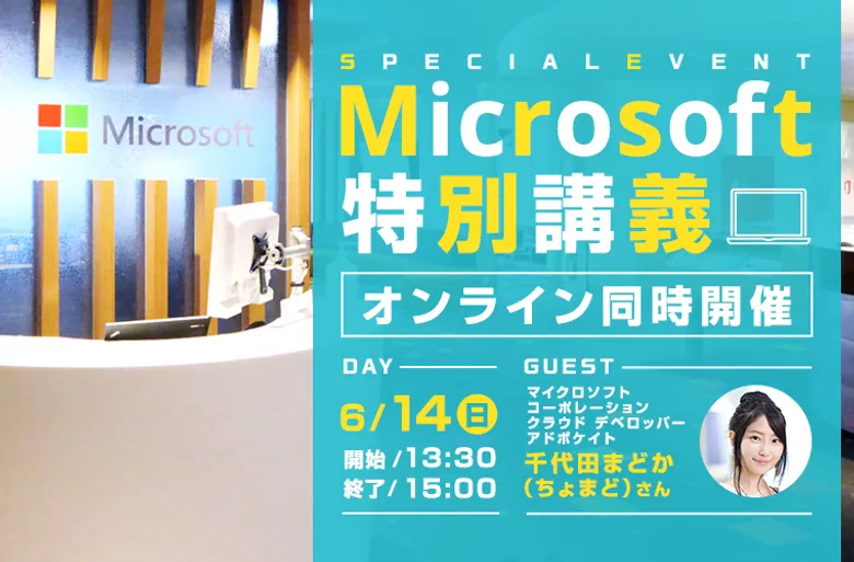 世界中で利用されているOS「Windows」を生み出したMicrosoft。そのマイクロソフト コーポレーション クラウド デベロッパー アドボケイトの千代田まどか(ちょまど)さんの特別講義!会場とお家から参加できるオンライン講義も同時開催です。